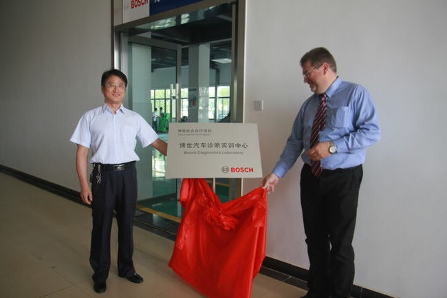 2012年10月8日上午博世集团汽车售后事业部执行副总裁文斯托夫先生,南京博世总经理马克思等一行到访乐动在线登录参观并举行“博世汽车诊断实训中心”揭牌与“博世南京双元制合作班”开班仪式。